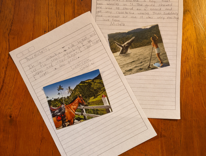 In our next class, I brought a handful of photos, each one depicting some kind of travel adventure. Val picked a picture of a horse in a beautiful mountain landscape, and I chose a photo of a whale watching excursion. Finally putting pen to paper, we each wrote a letter to describe the epic journeys and activities we imagined for ourselves based on the photos.