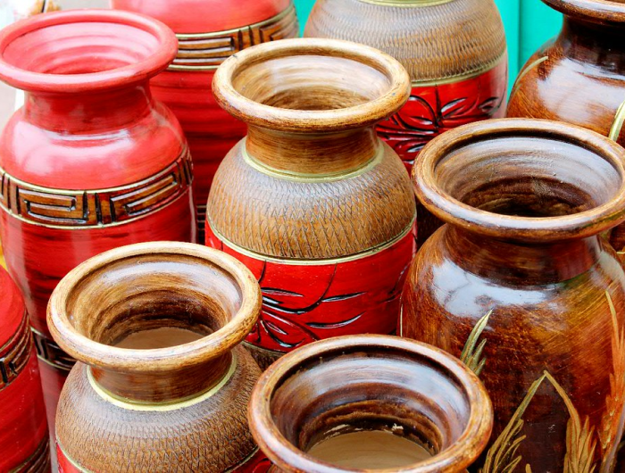 Use on to describe a position above or supported by or in contact with something (on the desk, on the potter’s wheel, on the plate). Example: She puts the ceramics on the shelves when they are finished.